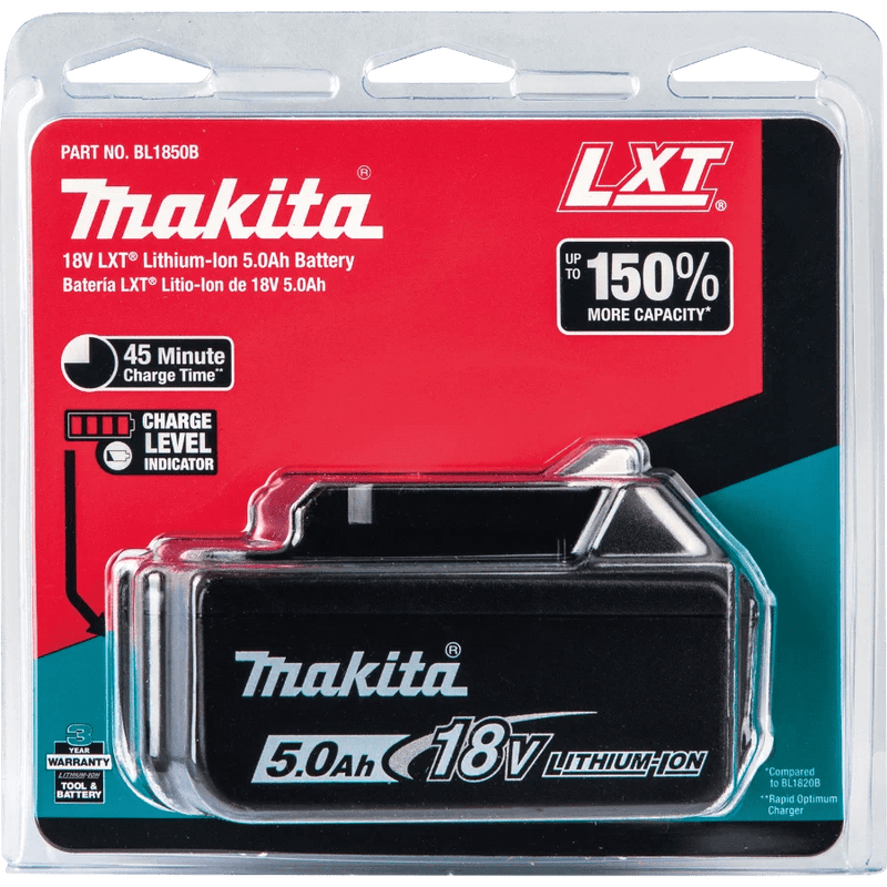 The Makita 18V LXT® Lithium-Ion battery charges faster and works longer than standard lithium-ion batteries, giving you and your cordless tools unmatched performance and productivity to take on the most demanding applications. The Makita 5.0Ah battery has a category-leading charge time of only 45 minutes, so it spends more time working and less time sitting on the charger.