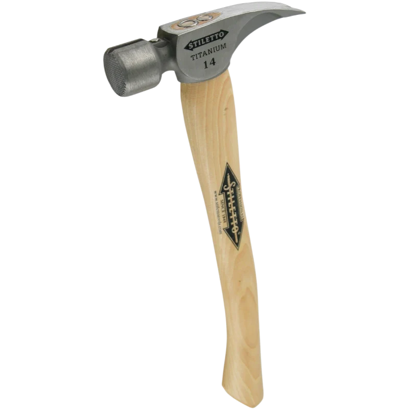 The STILETTO® 14oz Titanium Hickory Hammer with Milled Face and 16" Curved Handle is made with shock-absorbing USA Hickory. This 14oz titanium hammer hits like a 24oz steel hammer with 45% less weight and 10x less recoil shock. It is recommended for rough framing and remodeling. The Titanium Hickory Hammer includes a magnetic nail starter and replaceable handle.